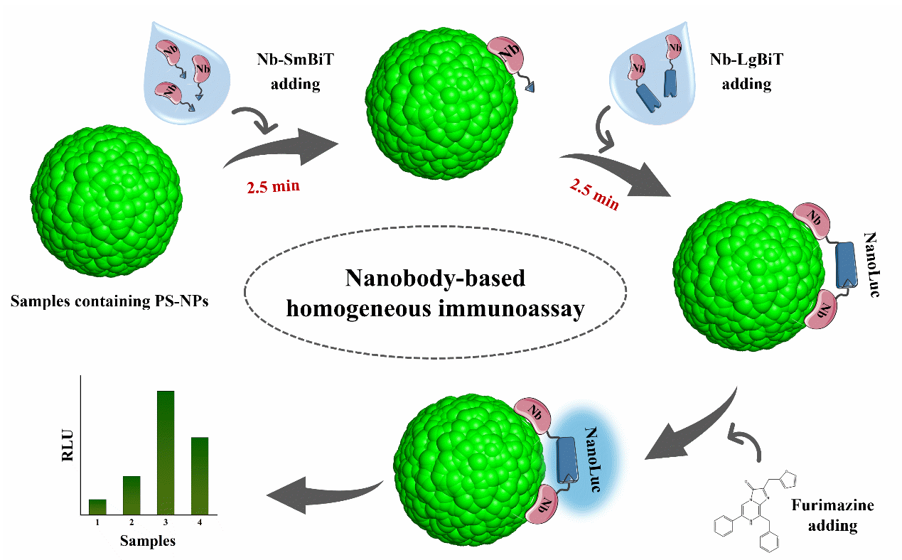 針對(duì)上述問題,青島能源所蛋白質(zhì)材料研究組立足前期研究基礎(chǔ),依托篩選獲得的高親和力聚苯乙烯結(jié)合納米抗體B2,構(gòu)建融合分裂型納米熒光素酶亞基(SmBiT/LgBiT)的雙功能探針,開發(fā)出一種基于納米抗體與分裂熒光素酶技術(shù)的均相免疫分析方法,成功實(shí)現(xiàn)對(duì)20納米聚苯乙烯納米塑料的高靈敏、快速定量檢測(cè)。其核心原理為當(dāng)分別標(biāo)記SmBiT和LgBiT的B2探針同時(shí)結(jié)合在同一納米塑料表面時(shí),分裂的熒光素酶亞基發(fā)生互補(bǔ)重構(gòu),產(chǎn)生可定量檢測(cè)的發(fā)光信號(hào),以此實(shí)現(xiàn)對(duì)目標(biāo)納米塑料的精準(zhǔn)識(shí)別與定量分析,為環(huán)境納米塑料污染溯源、風(fēng)險(xiǎn)評(píng)估與監(jiān)管決策提供了重要技術(shù)支撐。