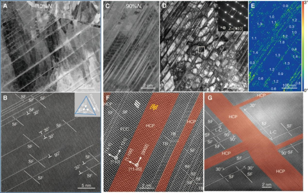 通過在傳統(tǒng)304奧氏體不銹鋼中引入空間梯度序構(gòu)位錯(cuò)胞結(jié)構(gòu),成功實(shí)現(xiàn)了高強(qiáng)度與優(yōu)異抗循環(huán)蠕變性能的兼得:其屈服強(qiáng)度提升2.6倍,同時(shí)較相同強(qiáng)度的不銹鋼及其它合金,其棘輪應(yīng)變速率降低了2-4個(gè)數(shù)量級(jí)(圖1),突破了結(jié)構(gòu)材料抗棘輪損傷性能難以提升的瓶頸。這種超低棘輪應(yīng)變速率的實(shí)現(xiàn)源于梯度位錯(cuò)結(jié)構(gòu)在非對(duì)稱循環(huán)應(yīng)力條件下,通過高密度層錯(cuò)以及由面心立方到密排六方(FCC-HCP)馬氏體共格相變主導(dǎo)的位錯(cuò)胞持續(xù)動(dòng)態(tài)細(xì)化新機(jī)制(圖2),與傳統(tǒng)位錯(cuò)、孿生及非共格相變等機(jī)制存在本質(zhì)區(qū)別。獨(dú)特的亞十納米共格層片結(jié)構(gòu)不僅顯著阻礙位錯(cuò)/層錯(cuò)運(yùn)動(dòng),又能高效存儲(chǔ)缺陷、增強(qiáng)動(dòng)態(tài)應(yīng)變硬化,并有效抑制動(dòng)態(tài)恢復(fù)和結(jié)構(gòu)粗化伴隨的應(yīng)變局部化,顯著提高抗棘輪損傷能力。